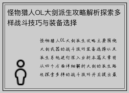 怪物猎人OL大剑派生攻略解析探索多样战斗技巧与装备选择
