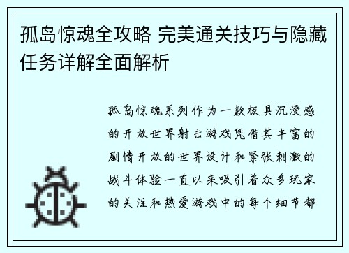孤岛惊魂全攻略 完美通关技巧与隐藏任务详解全面解析