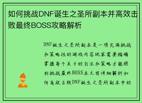 如何挑战DNF诞生之圣所副本并高效击败最终BOSS攻略解析